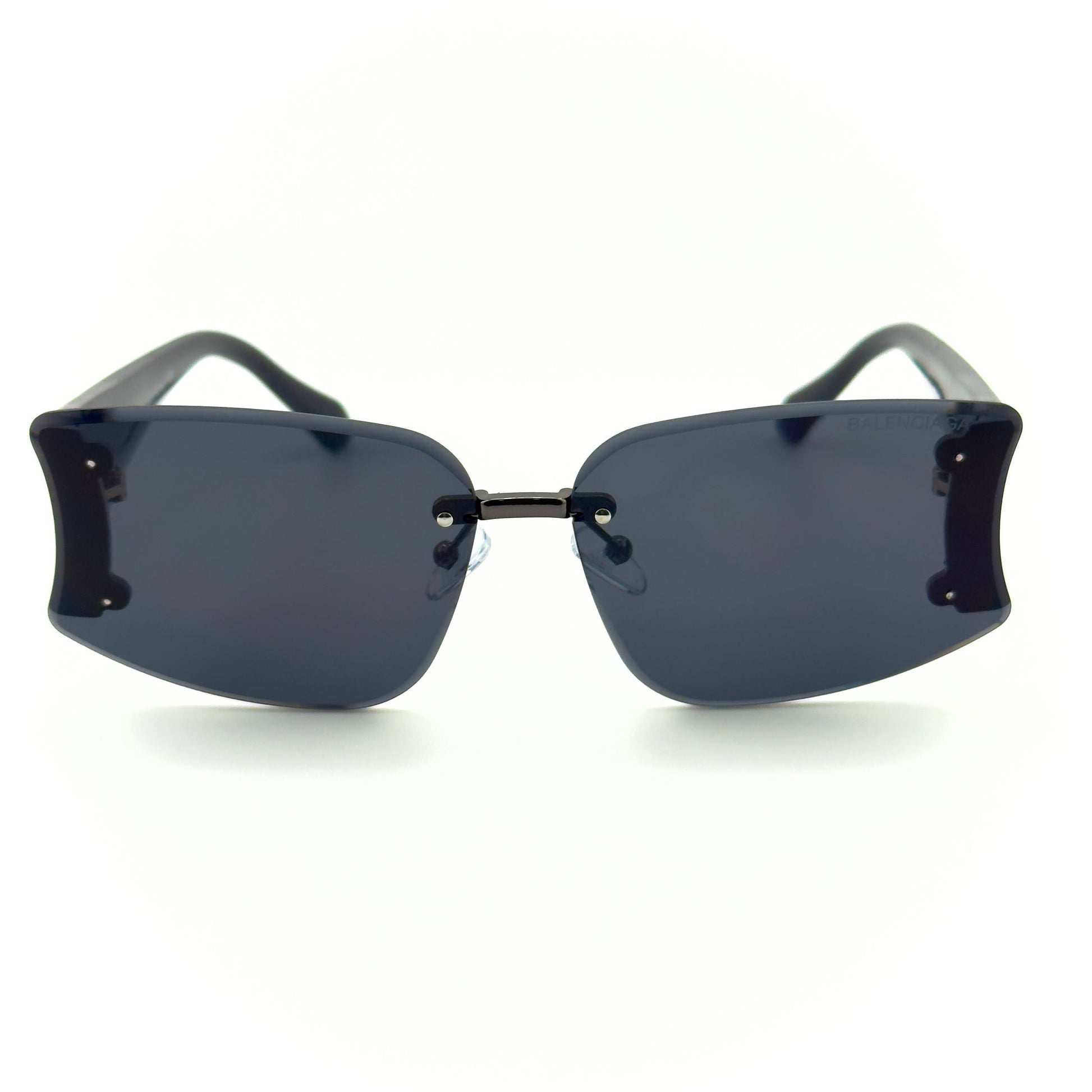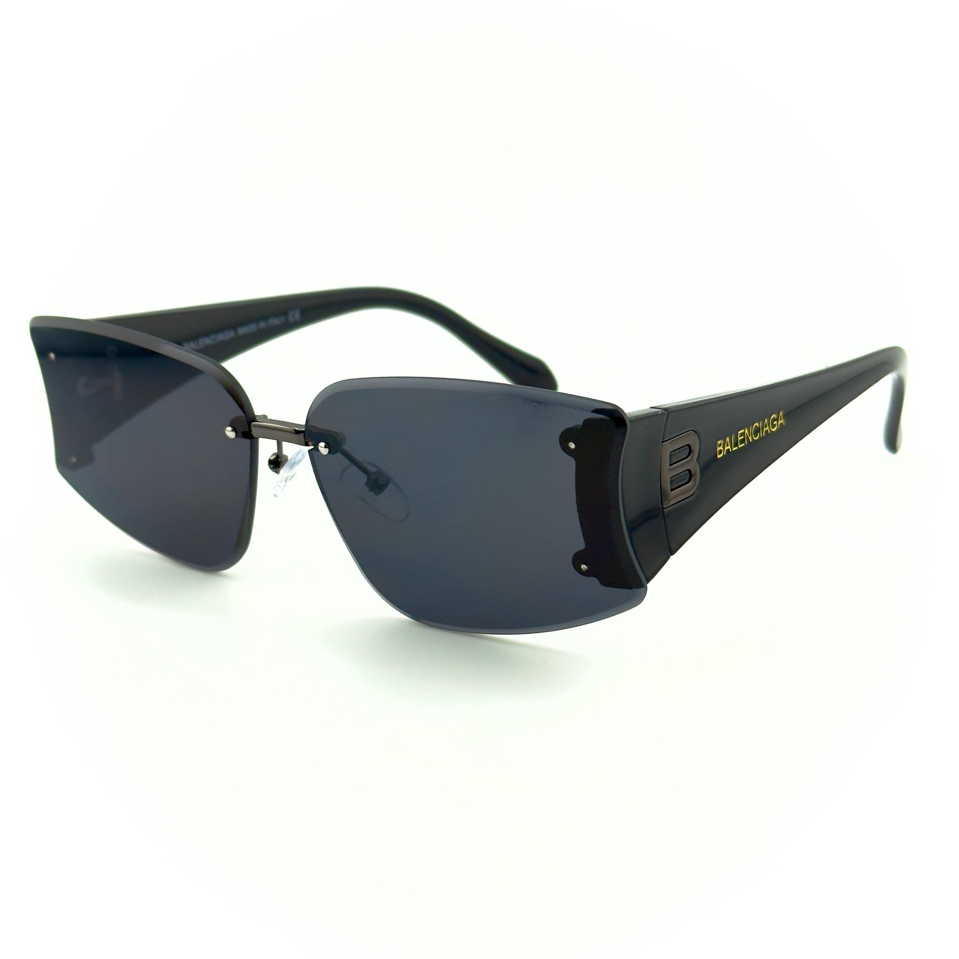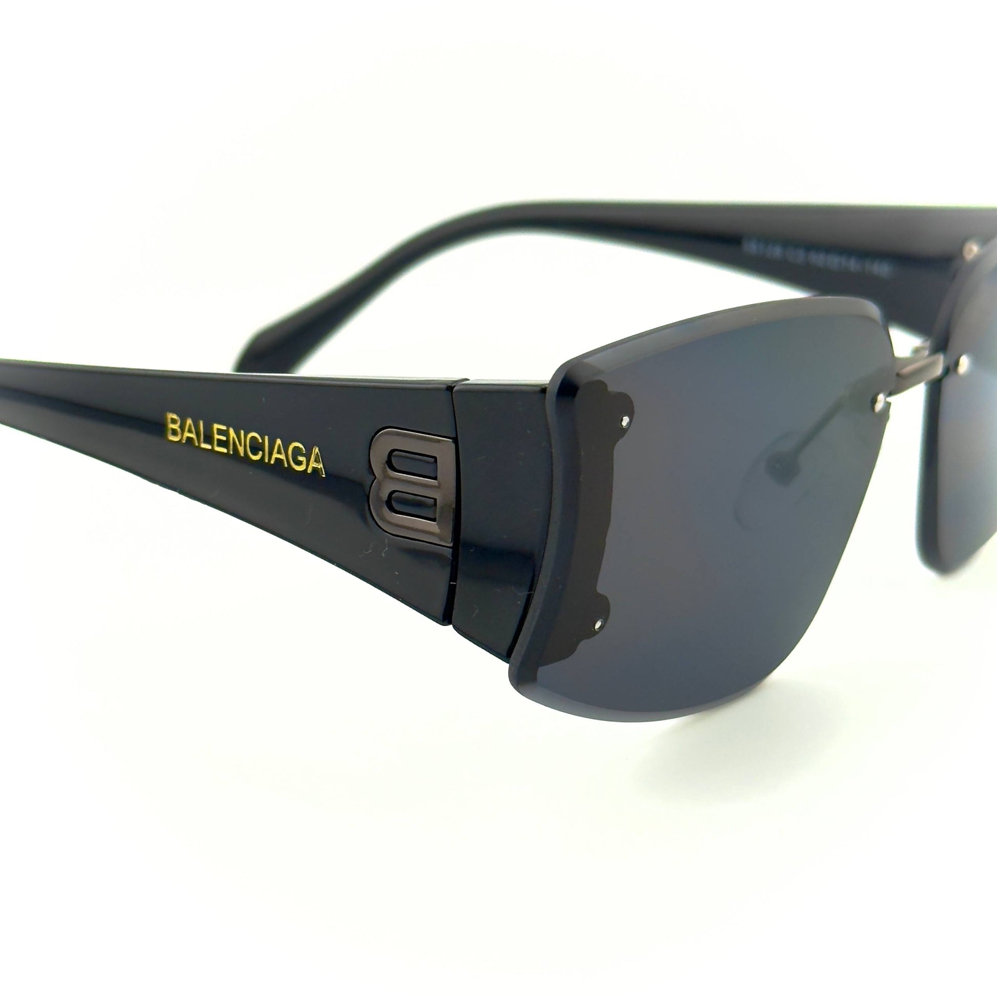 Bold and sleek. These rimless Balenciaga butterfly shades pair glossy black temples—finished with the raised “B” logo and gold BALENCIAGA script—with deep smoke lenses for a sharp, high-fashion look that still feels effortless. Comes with full packaging.