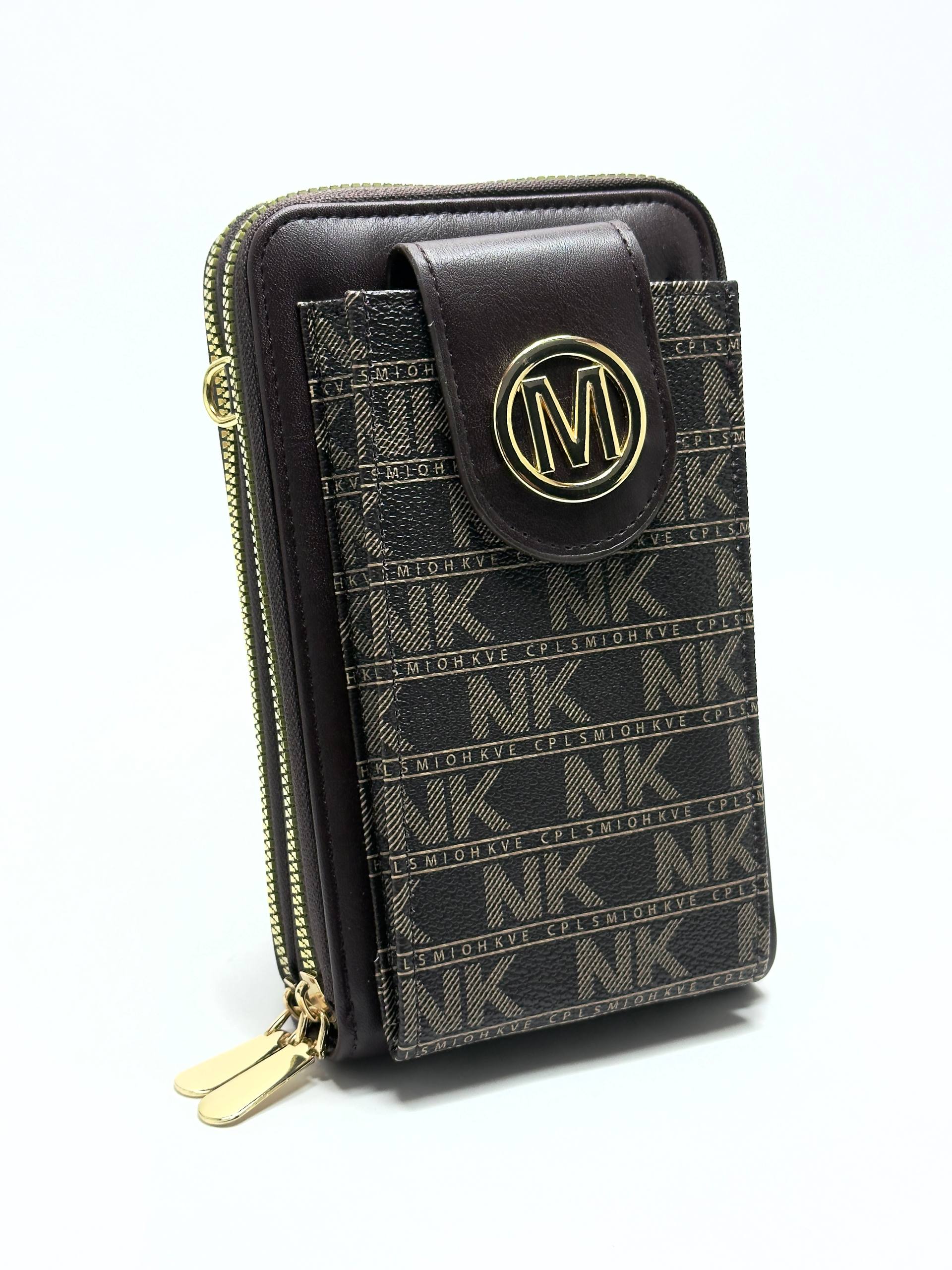 This luxury dual-zip wallet blends modern design with classic elegance. Crafted in deep brown leather and patterned canvas, it features gold-tone zippers and a signature circular emblem on the clasp for a premium finish. The spacious compartments and secure double zipper design make it perfect for organizing cash, cards, and essentials in style.
