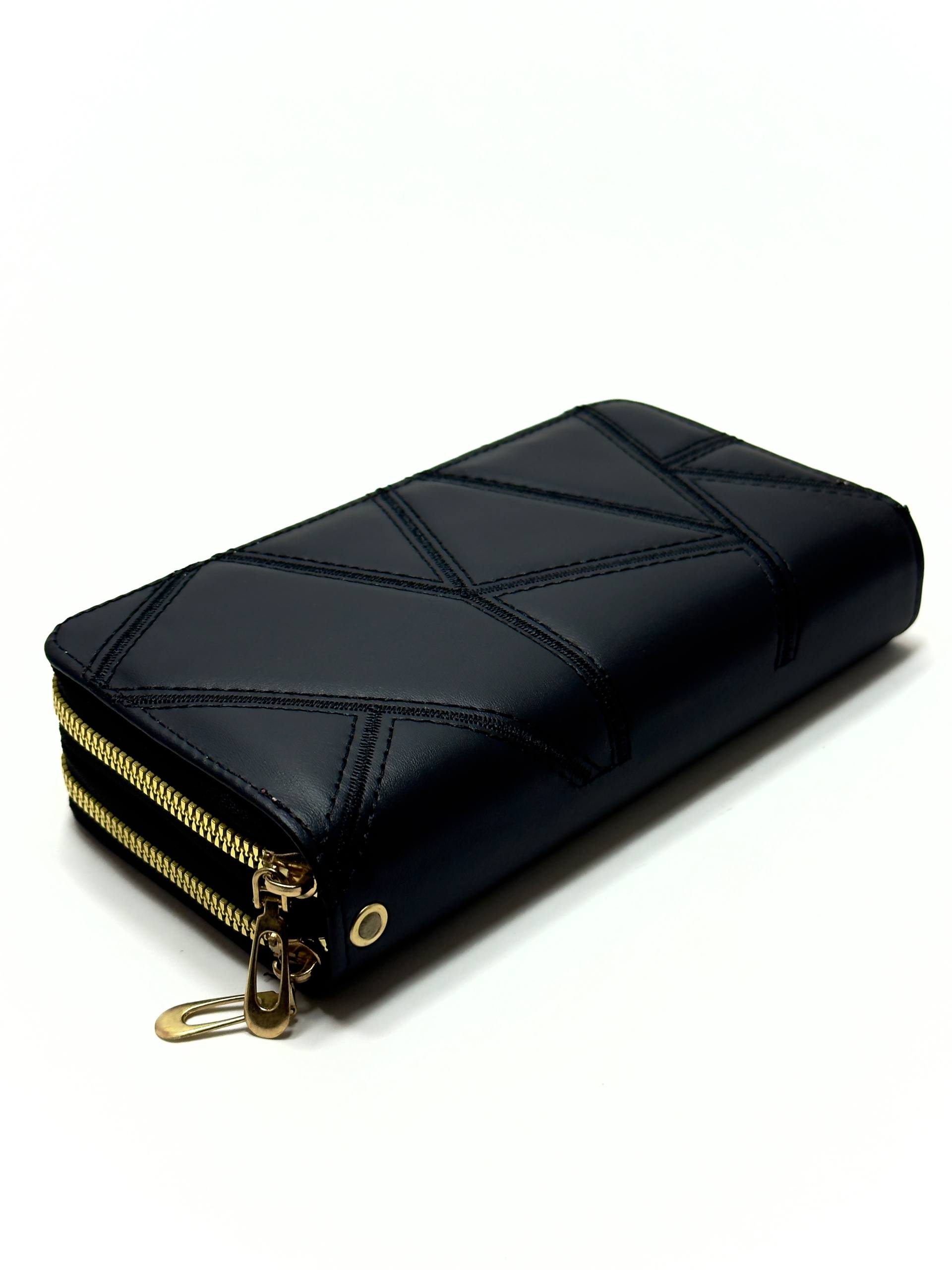 The Double Zip Wallet in Black redefines everyday elegance with a modern edge. Crafted from high-quality leather, it features a bold geometric stitch design and dual gold zippers for secure organization. Sleek, versatile, and timeless — perfect for carrying your essentials in refined style.