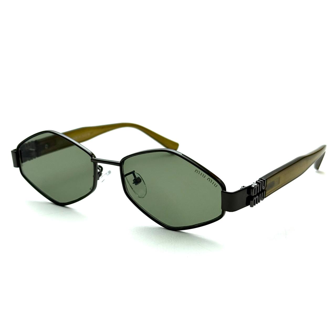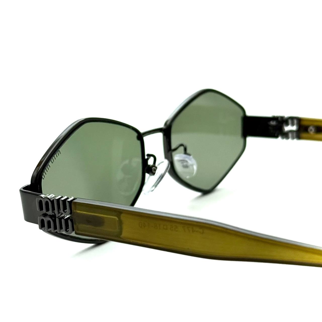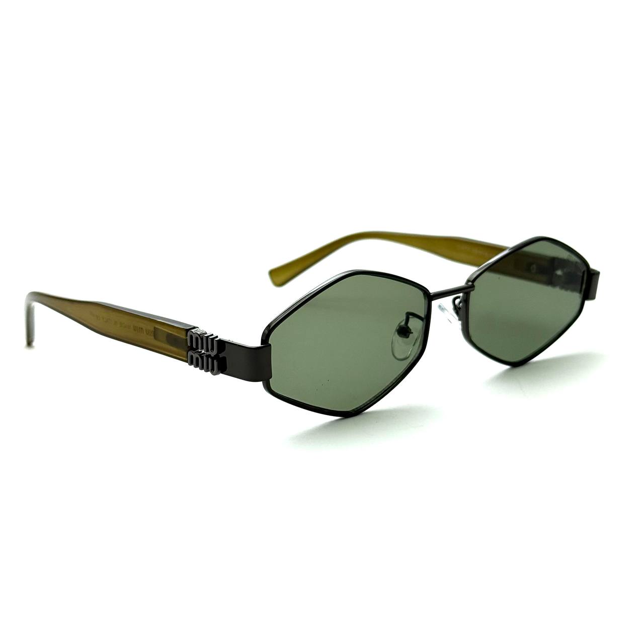 These Miu Miu sunglasses have cool hexagon lenses with a deep green color. The black frame and olive-green arms make them look special. They're light and comfy with nose pads you can adjust. Perfect for any fun day out!