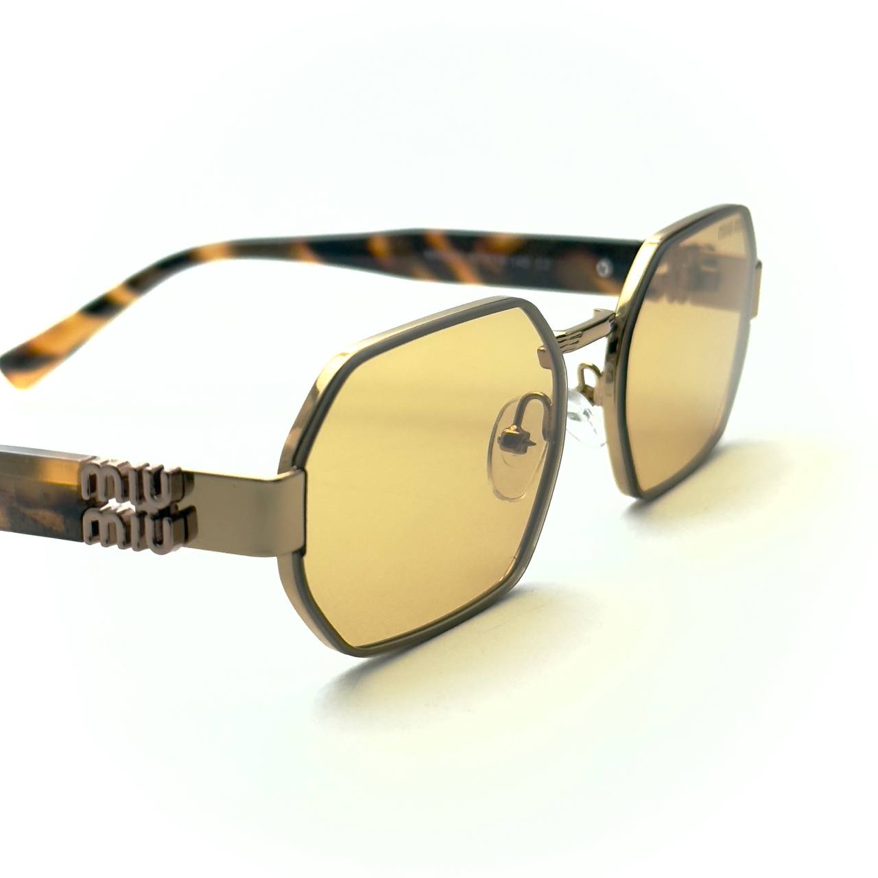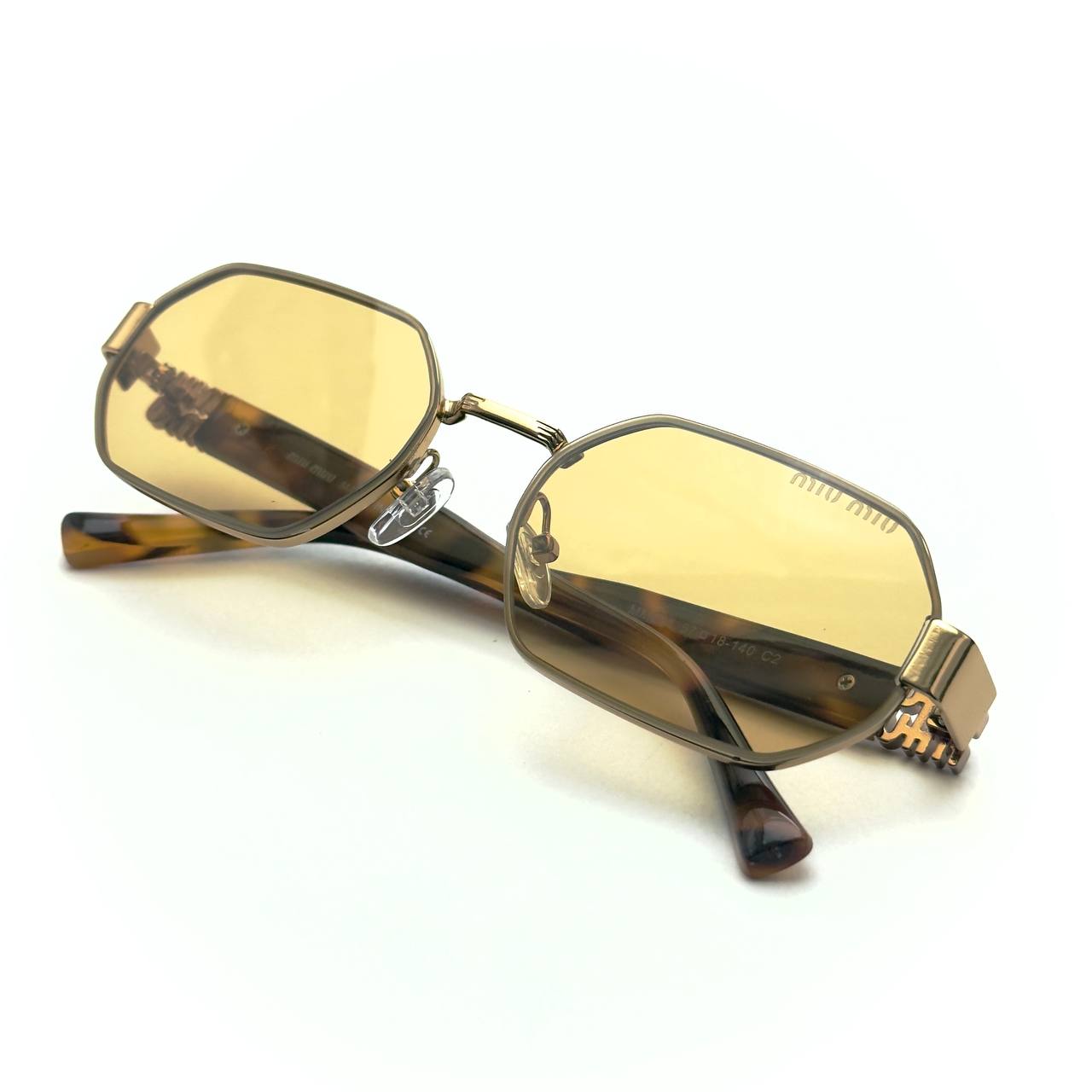 These Miu Miu sunglasses feature warm amber lenses in a striking geometric frame, matched with Havana-patterned arms and stacked Miu Miu logos for instant elegance.