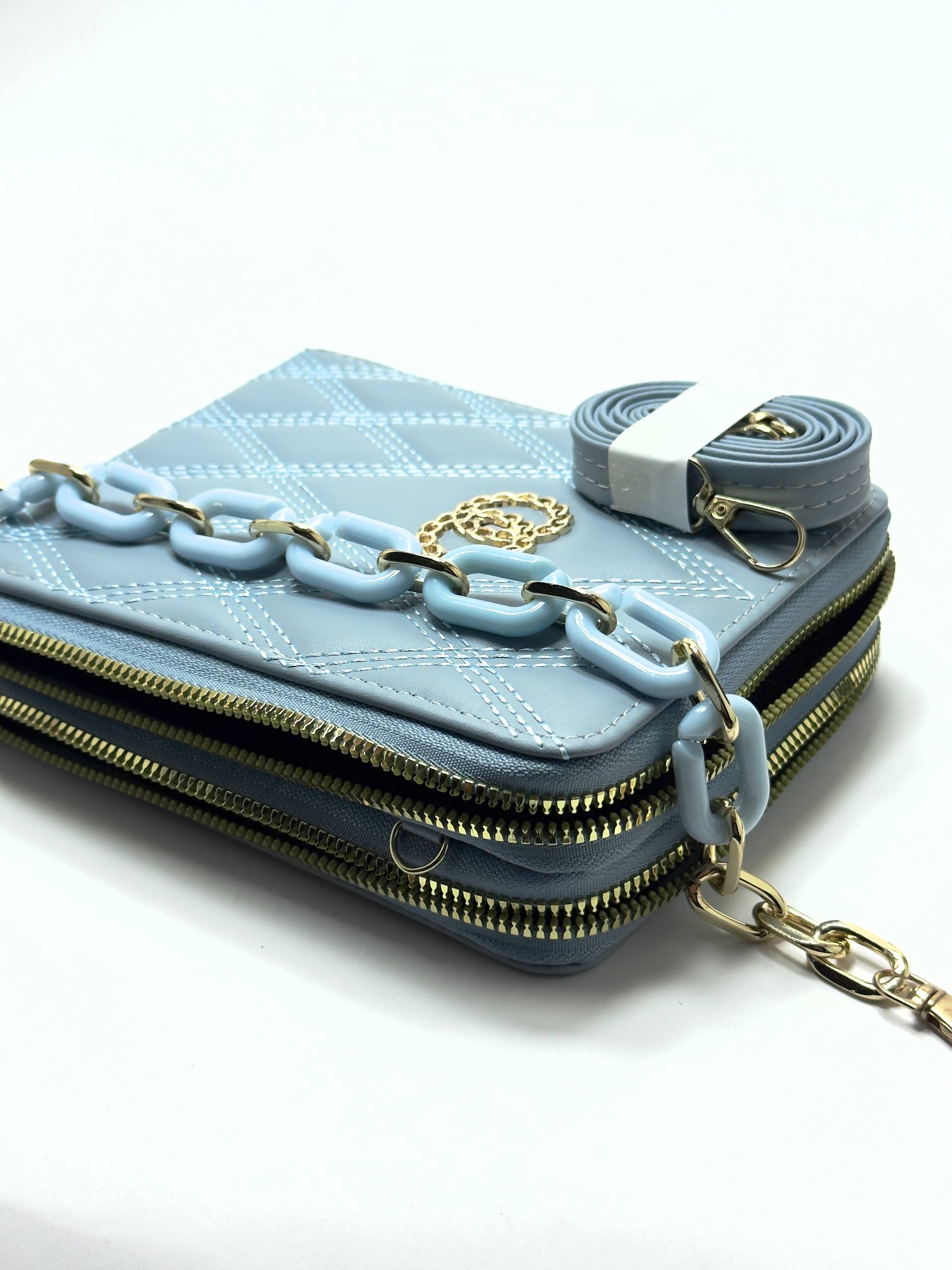 This elegant quilted wallet showcases a sleek Blue leather exterior with diamond stitching and double gold zippers for refined functionality. The centerpiece features a gold-tone chain logo emblem, giving it a high-end, designer-inspired look. With dual compartments and durable zippers, it perfectly balances luxury and practicality for everyday use.