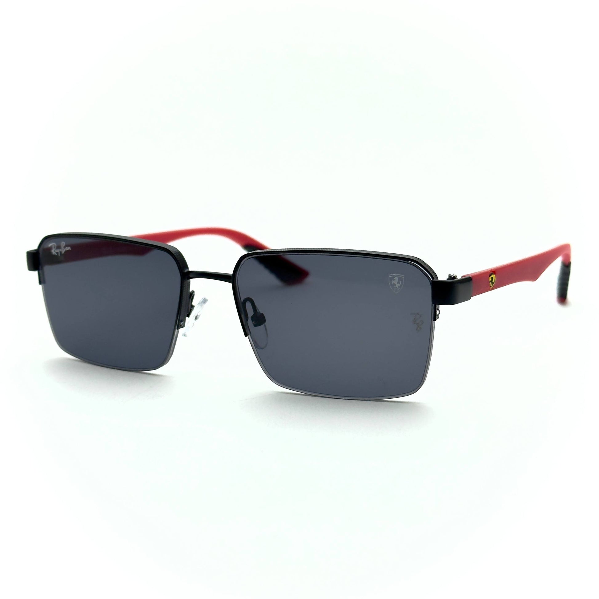 Sleek and bold, the RB2241 brings Ferrari’s racing spirit to a square frame design. Featuring black metal frame, dark grey lenses, and signature red Ferrari temple tips for a sporty edge.